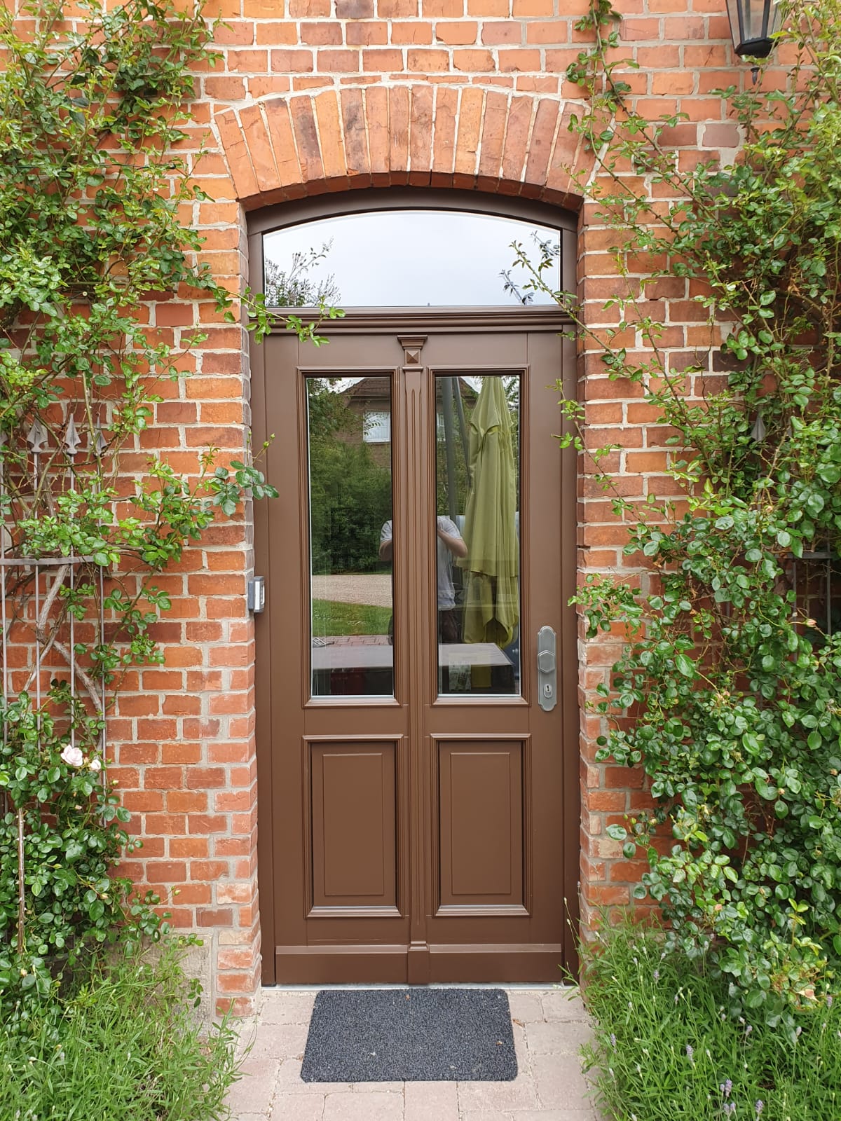 HaustürDie einwärtsöffnende Holzhaustür wurde in historischer Ausführung gefertigt und mit stilvollen Zierelementen sowie einer Sonderform im oberen Bereich ausgestattet.